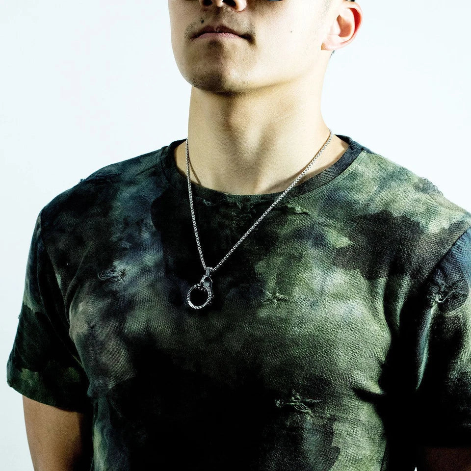 โข Stainless steel pendant necklace for men with silver finish. โข Features a stylish ring challa design for a modern look. โข High-quality chain for durability and long-lasting wear. โข Perfect accessory for men's fashion and casual wear. โข Latest design pendant necklace to elevate your style. โข Ideal for gifting or adding to your own jewelry collection.